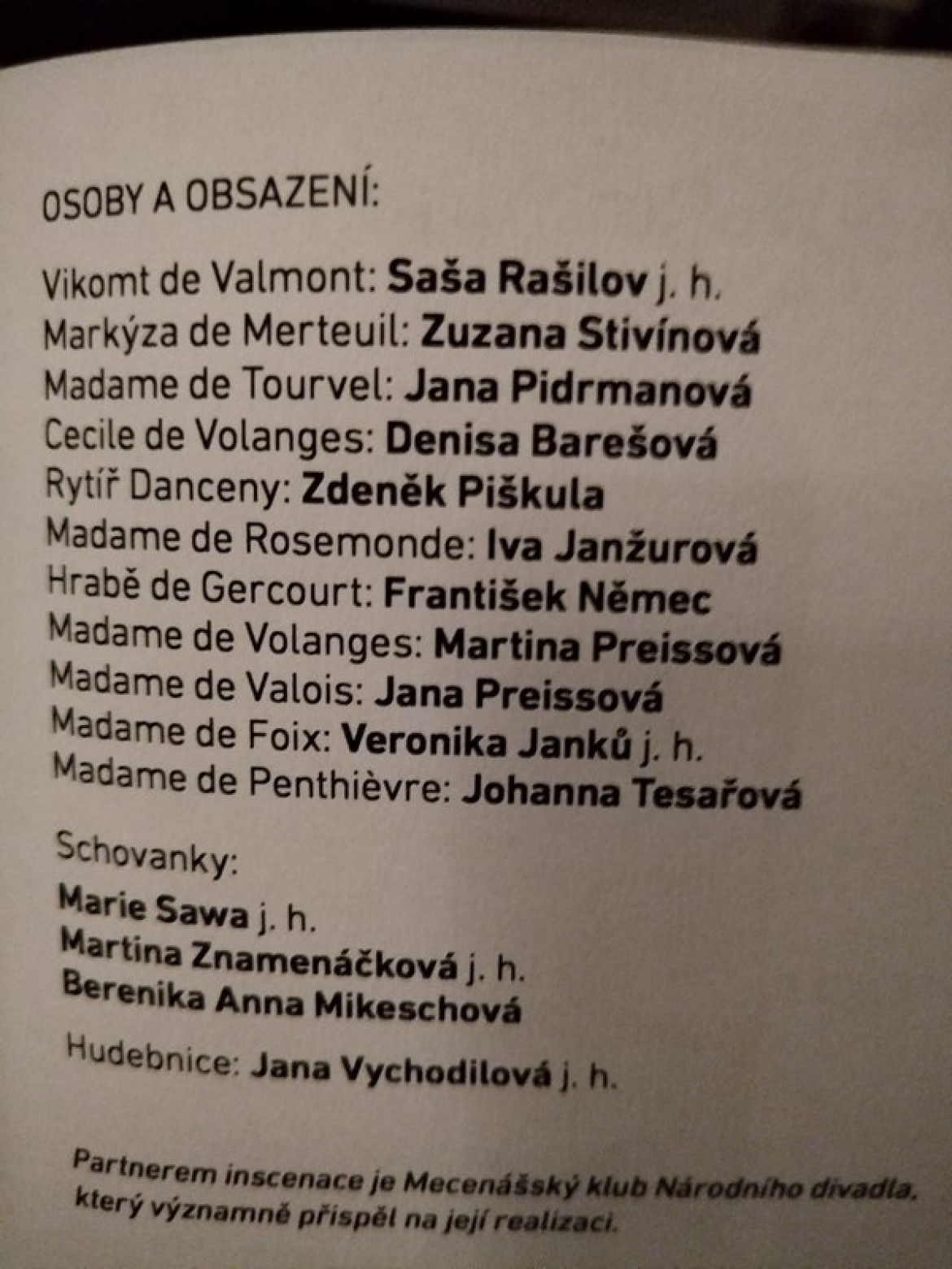 Pro tento večer jsme měli možnost zhlédnout inscenaci se skutečně hvězdným hereckým obsazením: Iva Janžurová, František Němec, Martina Preissová, Jana Preissová, Saša Rašilov, Jana Pidrmanová, Denisa Barešová a Zuzana Stivínová podali skvělé výkony. Oko našich studentek potěšil především Zdeněk Piškula.